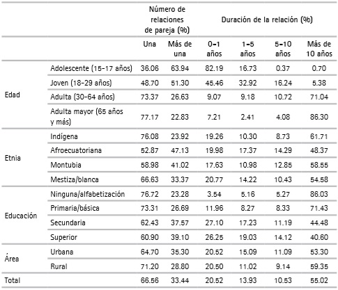 La mayoría de las mujeres reportan haber tenido una sola relación (66.56 %); esto se da especialmente en mujeres adultas, mientras que más de la mitad de las adolescentes y jóvenes reportan más de una relación. La mayoría de las relaciones duran más de diez años (55.02 %), seguidas de hasta un año (20.51 %). Las mujeres con menor nivel educativo reportan relaciones prolongadas de más de diez años (Cuadro 5).