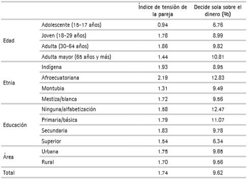 El índice de tensión de la pareja tiene un valor promedio de 1.74 sobre 178. Las mujeres adultas y jóvenes registran mayores niveles de tensión, así como las afroecuatorianas e indígenas (Cuadro 6). Con relación al control del dinero, solamente el 9.62 % de las mujeres deciden solas qué hacer con su propio dinero. El mayor porcentaje de mujeres que reportan autonomía en las decisiones sobre su dinero son mujeres adultas mayores y adultas, afroecuatorianas y aquellas con poca educación formal (Cuadro 6).
