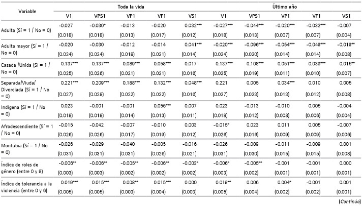 La variable de roles de género registra una relación negativa con la violencia. Este resultado puede estar asociado con que la aceptación de roles tradicionalmente femeninos reduce el reconocimiento de ser víctima de algún tipo de violencia. Por su parte, el índice de tolerancia a la violencia se presenta como un factor de riesgo de sufrir violencia física, psicológica y patrimonial (Cuadro 7).