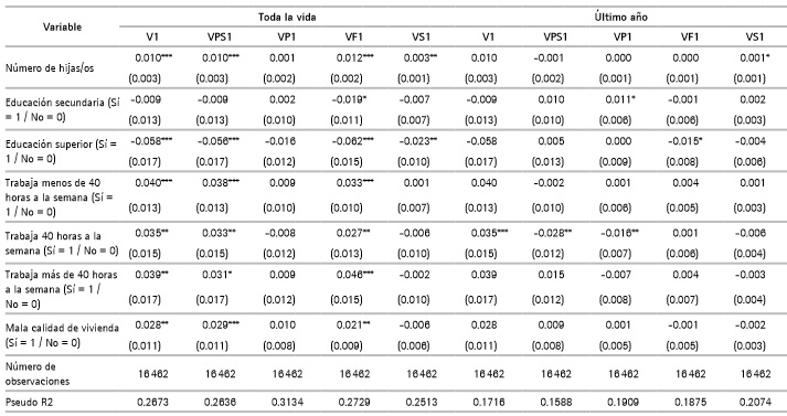 Otros factores individuales como el número de hijos e hijas y el trabajo de la mujer, que han sido objeto de estudio de variadas investigaciones con resultados contradictorios, reportan efectos que requieren una mayor profundización. El modelo desarrollado muestra que la presencia de hijos o hijas se conecta con una mayor probabilidad de sufrir violencia doméstica (Cuadro 7), con excepción de la violencia patrimonial en que el efecto es no significativo.