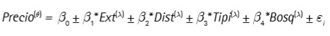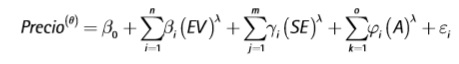 La metodología permite identificar las características que explican el precio del predio y determinar los precios implícitos por cada una de estas, con base en la disponibilidad a pagar marginal. Aunque el método solo halla los valores de uso directo e indirecto de un bien o servicio ecosistémico, su principal limitante es el llamado problema de especificación, que consiste en el desconocimiento exacto de la forma funcional del modelo planteado, debido al gran número de variables explicativas. Como solución, surgieron las transformaciones Box Cox, que permiten hallar la forma funcional de mayor ajuste para los datos observados (Heyman y Sommervoll, 2019). De acuerdo con lo anterior, se definió el modelo general de la función de precios hedónicos en tierras rurales, donde la variable explicada Preciodepende de otras variables de diferente naturaleza (Ecuación 3):