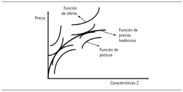Al fijar las condiciones de primer orden del problema, se llega ∂U/∂Z= λp, la cual indica que la utilidad marginal no observable ∂U/∂Z puede verse como una aproximación al costo marginal que puede ser medible a través de λp. La función de precios es igual a una ecuación establecida en función de sus características P = P(q, z1, z2, …zm), que representa los precios en el equilibrio obtenido, cuando las pendientes de la función de oferta y postura son iguales y tales puntos describen una curva (Figura 1).