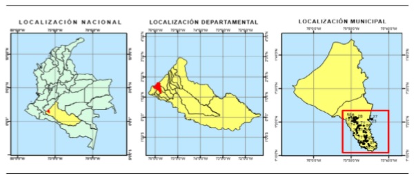 De una población de 300 predios en la zona (MinAgricultura e ICA, 2019) se extrajo una muestra de 90 predios (equivalentes al 30 % de la población) bajo muestreo estratificado proporcional al tamaño del estrato, con desviación muestral de 0.5 y un margen de error de 8 % (Hernández et al., 2014). Entre las limitantes del estudio que explican el reducido tamaño de muestra, se encuentran los aspectos relacionados con la dificultad del acceso a las fincas (por el estado de las vías) y la tensión que manifestaron algunos productores en la zona rural para proporcionar la información debido a problemas asociados al orden público (delincuencia común y grupos al margen de la ley).