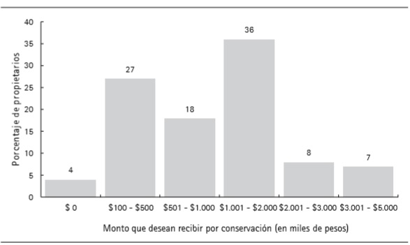 El monto del pago a recibir osciló entre $ 100 000 y $ 5 000 000 al año, con un promedio de $1 040 000. El 4 % respondieron que no están interesados. Esto puede explicarse por la inexistencia de bosques en sus fincas.