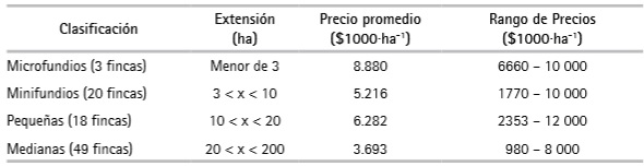 Las fincas tuvieron una extensión promedio de 37.8 ha entre un valor mínimo de 0.25 ha y un máximo de 178 ha. El precio por hectárea de tierra osciló entre1.2 y 19.2 smmlv7, con promedio de 6.0 smmlv. La distancia promedio de los predios hasta la cabecera municipal fue de 24.2 km. El precio por hectárea del predio variaba según su extensión (Cuadro 1).