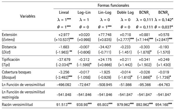 Los resultados de las regresiones para los modelos lineal, semilogarítmico Lin Log, Log Lin, Doble Log, Box Cox no restringido 1 y Box Cox no restringido 2 permitieron observar y analizar la estabilidad de cada variable. Las variables Extens y Bosq fueron robustas y consistentes en cuatro de los seis modelos estimados con signos positivo y negativo respectivamente. El coeficiente negativo de las coberturas de bosque en los seis modelos puede traducirse como el costo de oportunidad de uso que tiene la tierra. Las variables Dist y Tipi no fueron relevantes estadísticamente, pero en el caso de la distancia mantuvo su signo en todos los modelos y fue significativa en dos de ellos (Cuadro 2).
