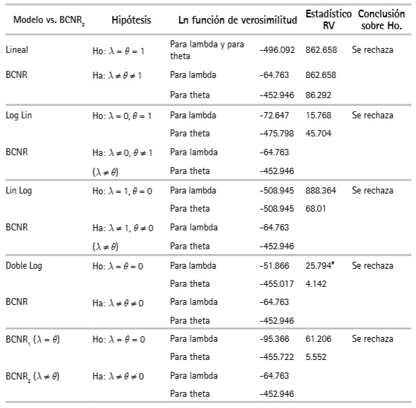 Para la elección de la forma funcional se realizaron pruebas de hipótesis y los resultados de la razón de verosimilitud se contrastaron con el valor crítico en tablas con 1 grado de libertad (1 restricción) a un nivel de significancia del 5 % el cual es de χ2 = 3.841 (Cuadro 3).