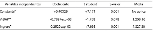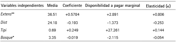 Los coeficientes de las variables VrDAP e Ingreso arrojaron el signo esperado (negativo y positivo respectivamente) y gozan de validez estadística. El modelo arrojó una bondad de ajuste superior al 98 % según los valores predichos. Aplicando la ecuación 5 en el promedio de los datos, la DAP media fue$ 1124.52 con un valor mínimo de $ 100 y un máximo de $ 4000. El ingreso familiar mensual según los jefes de hogar encuestados se encuentra entre $ 500 000 y $ 5 500 000.