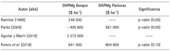 Respecto de los atributos o características de las cuales depende el precio de las fincas, los resultados obtenidos en este estudio fueron coherentes con los reportados por Ramírez (1998), quien encontró que el precio de las fincas depende de características estructurales, como la distancia, las condiciones de las vías de acceso y la extensión del predio, de características socioeconómicas, como la actividad ganadera, y de aspectos ambientales, como las áreas en bosque natural. Otros estudios de DAPMg en la Amazonia colombiana para diferentes usos del suelo, como las coberturas de bosques y pasturas, encontraron también la actividad ganadera estadísticamente relevante (Cuadro 6).