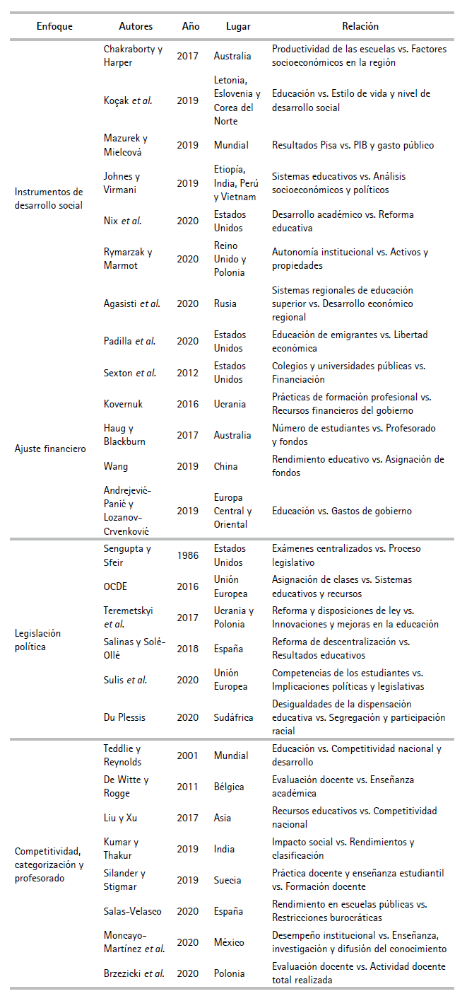 Para visualizar una posible relación entre eficiencia educativa y gobierno, se deben identificar los distintos puntos de vista que han dado los investigadores en dicho contexto. Así, la medición de la eficiencia en la educación puede connotar distintos efectos en el ámbito gubernamental, haciendo uso de dicha medida como un instrumento aplicable o argumentativo en las acciones y decisiones gubernamentales. En este orden de ideas, en el cuadro 1 se muestran cuatro enfoques discutidos en cuanto a esta relación: instrumentos de desarrollo social, ajuste financiero, legislación política y, por último, competitividad, categorización y profesorado. Se identifican el tipo de relación, los autores que efectuaron el estudio, la región en la que se centró el estudio y el año de publicación del artículo de investigación.