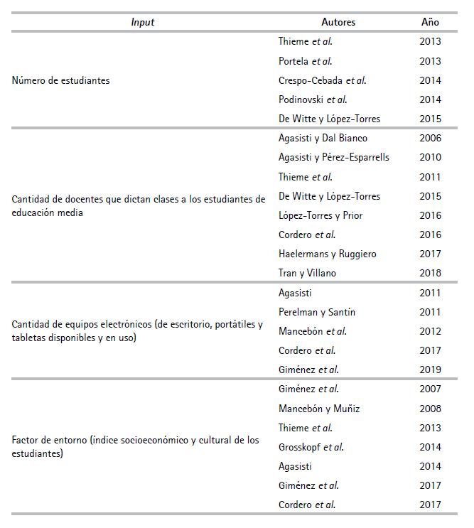 Los inputs con que se elabora este estudio son acordes con las variables utilizadas en la línea de eficiencia en la educación, los cuales se pueden encontrar en la literatura: cantidad de alumnos matriculados (aptos o que presentaron la prueba), cantidad de docentes, equipos electrónicos, así como un índice socioeconómico (categorizados de uno a cuatro, que incluyen distintas características tanto de los estudiantes, en su ambiente individual, como de la institución, en su ambiente colectivo). El cuadro 2 relaciona los inputs tomados, con los autores y año de publicación del artículo.