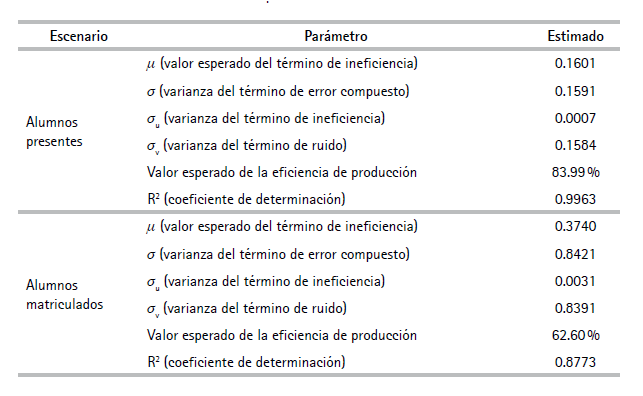 Por otro lado, la varianza del término del error compuesto está dada por la suma de las varianzas del término de ineficiencia y del término del ruido. En ambos escenarios el comportamiento del término del ruido es mayor y corresponde al 99.56% y al 99.64%, respectivamente, de la varianza total. Este resultado pone en evidencia la ventaja de los métodos paramétricos sobre los no paramétricos, los cuales al basarse en planteamientos estadísticos permiten considerar el ruido aleatorio generado por errores de medición (Lotero y Castellanos, 2008) o por alguna equivocación en el reporte de los datos de las instituciones educativas.
