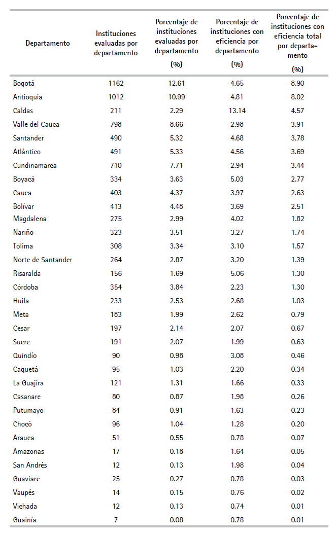 Ahora, al hacer un análisis de los resultados obtenidos teniendo en cuenta el segundo nivel de agregación, es decir por departamentos, cabe resaltar que los departamentos que tienen mayor porcentaje de instituciones que parecen presentar eficiencia son Bogotá, Antioquia y Caldas. Así mismo, tal como se puede evidenciar en el cuadro 4, los departamentos que tienen menor porcentaje de instituciones que presentan eficiencia son San Andrés, Guaviare, Vaupés, Vichada y Guainía. Estos resultados demuestran la centralización existente en cuanto a desarrollo y gestión de recursos, ya que los dos departamentos que revelan mayor eficiencia son los departamentos más sobresalientes de Colombia, en muchos aspectos (no solo en lo educativo); más aún cuando se comparan con el tercer departamento del cuadro, en adelante.