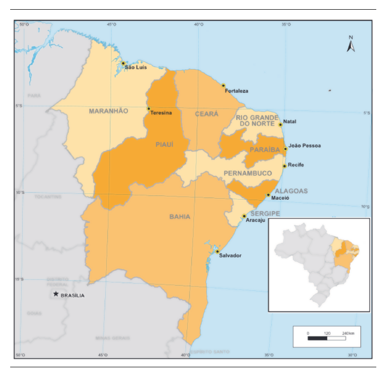 One area of the country that has contributed significantly to obtaining these results is its northeast region. Figure 1 shows the Brazilian states that compose the country’s northeast region and the location of the region on the country map.