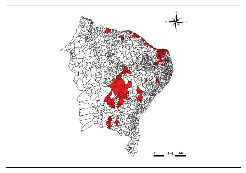 The contiguity matrix W implies a high degree of arbitrariness in its specification, mainly taking into account the irregularity of the maps of municipalities and census sectors (Carvalho Ywata; Albuquerque, 2011)