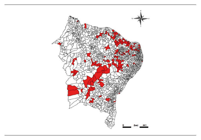 Figure 2 shows the localization of wind power plants on the map of Brazil’s northeast region. The municipalities highlighted in red have at least one wind power plant installed.