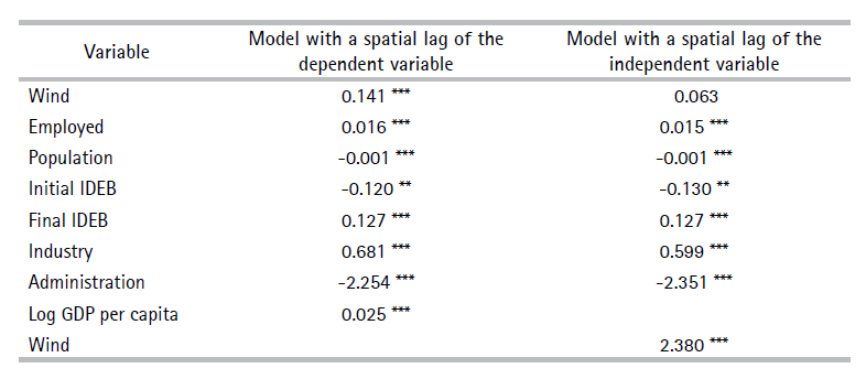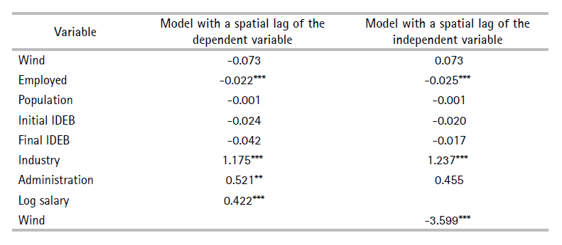 The only impacts that are statistically significant are the indirect and the total in the model with a spatial lag of the independent variable. These impacts are negative; that is, the presence of wind power plants in a municipality seems to reduce the average salaries of workers living in neighboring municipalities. This evidence is supported by the study by Araújo, and Freitas (2008), which explains that the operation and maintenance of wind power plants, in general, do not demand many well-paid jobs locally. It is possible to operate and control the power plants at a distance using computers.