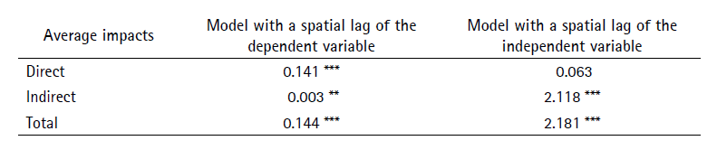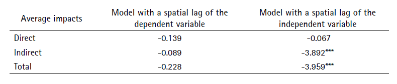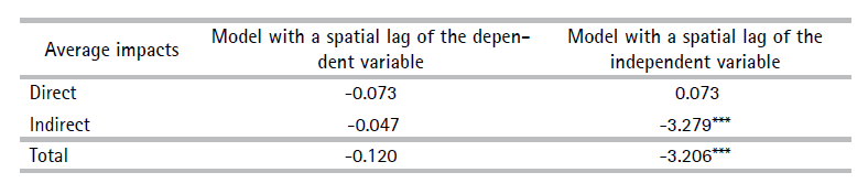 The direct effect is the effect of the change within the municipality, ignoring spillover effects. The indirect effect is the spillover effect (StataCorp, 2021). Table 6 presents the direct and indirect effects of the two models.