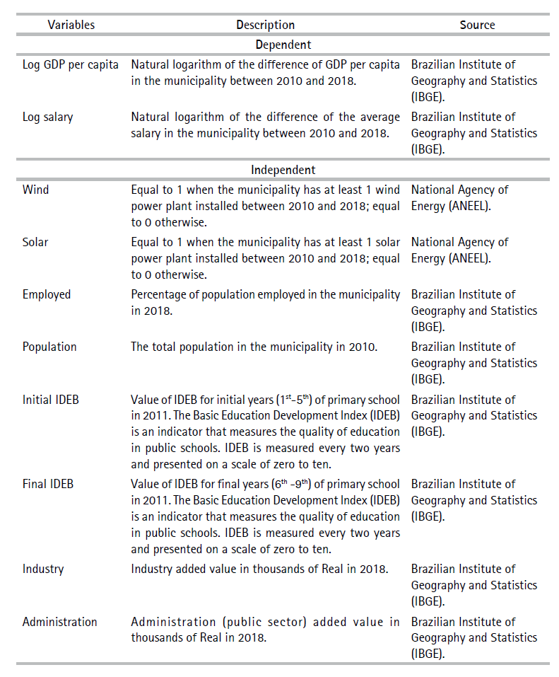 Table 3 below presents the average values of the variables used in this paper according to the presence of wind and solar power plants in the municipality. The first two variables are the dependent variables used in the spatial econometric analysis. In this case, it can be observed that municipalities that have a wind or solar power plant present a greater growth of GDP per capita than other municipalities in the 2010-2018 period. The same does not happen in the case of salary growth in the same period.