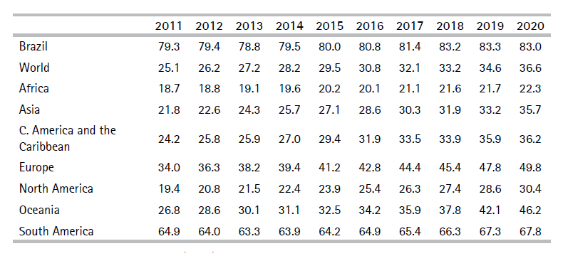 Table 1 compares the shares of renewable energy on total electricity capacity in Brazil with the same share in other areas in the world during the 2011- 2020 period. The table shows that Brazil has a larger share of renewable energy than the average of other regions in the world over the period considered. Even when considering the average share of South America, Brazilian leadership is confirmed.