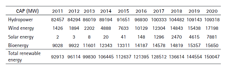 Table 2 shows the total capacity of renewable energy and divides this capacity according to the type of energy: hydropower, wind energy, solar energy, and bioenergy. The first piece of evidence that the table illustrates is rapid growth of solar energy in the country, as the total capacity moved from 2 megawatts in 2011 to 7881 megawatts in 2020 with a growth rate of 393950% in a decade.