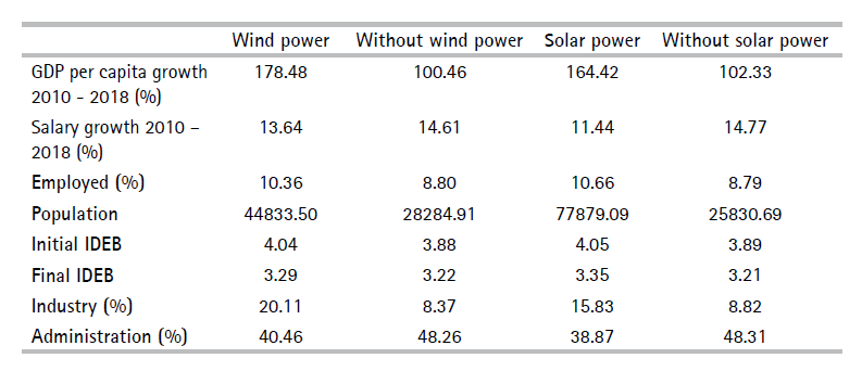 In the case of independent variables, municipalities with renewable power plants have, on average, a bigger share of the population employed, a larger population, a better indicator of initial IDEB, a larger share of added value from industry, and a smaller share of added value from public sector administration. Considering the final IDEB, the figures indicate that there is no relevant difference between municipalities with and without renewable power plants.