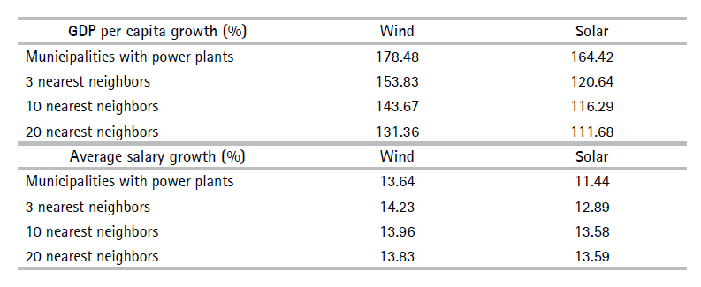 The following table (Table 4) presents the percentage of dependent variable growth (GDP per capita growth and average salary growth) in the municipalities where at least a renewable power plant is installed and in their three, ten, and twenty nearest neighbor municipalities.