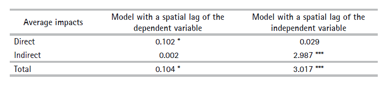 In the case of the spatial lag of the independent variable, the direct effect is 0.063, but this is not statistically significant. The presence of wind power plants in the municipality spills over to increase GDP per capita in neighboring municipalities. The result is a 2.118 percentage points increase in GDP per capita (indirect effect). The total effect is 2.181.