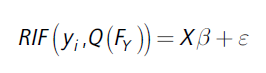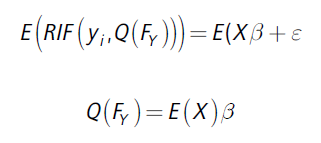 Precisamente, las regresiones cuantílicas no condicionadas brindan el marco de análisis para evaluar el efecto de las covariables sobre cambios a lo largo de la distribución de la variable dependiente. Para su estimación se utiliza la estrategia desarrollada por Firpo et al. (2009) como un caso especial de las regresiones RIF (por sus siglas en inglés), donde se estiman los efectos no condicionados parciales de un cambio pequeño en la distribución de X sobre la distribución del estadístico de interés. La propuesta es utilizar un modelo lineal para aproximar este efecto parcial. Por tanto, se asume una relación lineal entre las covariables y la RIF (yi, Q(Fy)) —Ecuación 3.
