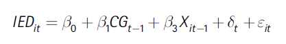 (1)donde i y t representan el país y el tiempo, respectivamente. β es el vector de parámetros por ser estimados. En la ecuación (1), IED es la variable dependiente “inversión extranjera directa” como porcentaje del PIB; CG, la variable explicativa “calidad del gobierno”, con fuente WGI; X es un vector de variables de control que incluye el crecimiento económico (variación anual del producto bruto interno), el logaritmo de la población total, el grado de apertura comercial, la disponibilidad de recursos naturales, el perfil de inversión; 𝒹 representa el efecto fijo temporal (se controla por shocks globales) y ε es el término del error.
