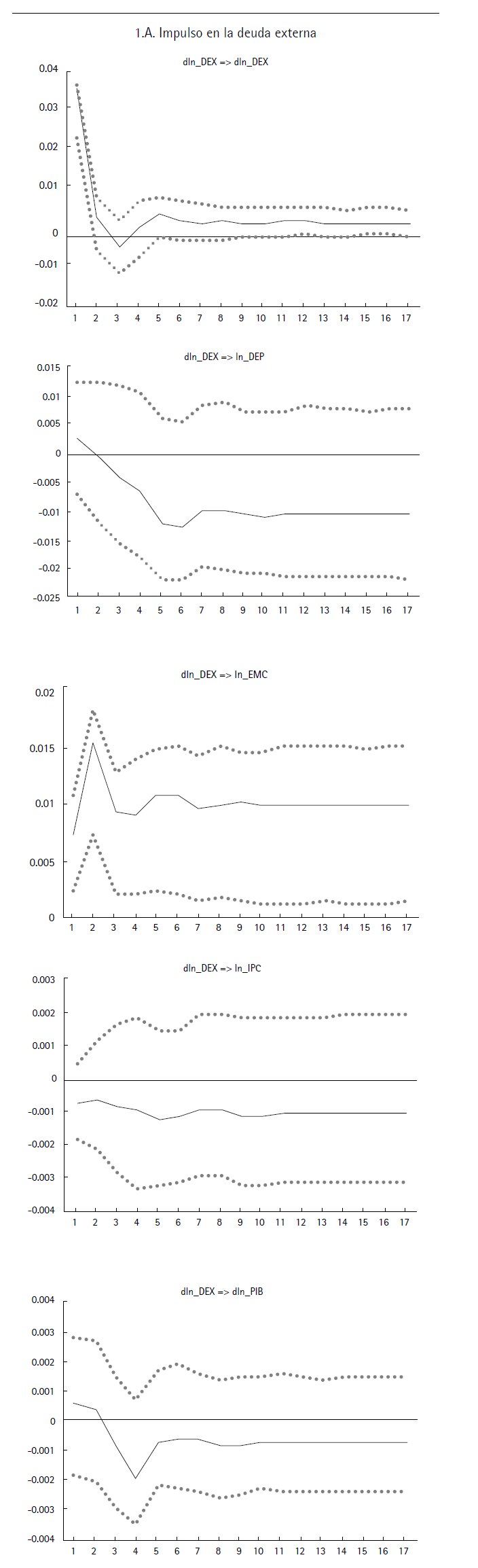 Para estimar las Firo es necesario que las variables Xt del modelo (5) se ordenen de la “menos” a la “más endógena” en términos contemporáneos. En el contexto teórico, este orden de variables responde a la motivación planteada al inicio del artículo: se busca un orden que evalúe la posibilidad de que la neutralidad monetaria en dolarización provoque que los regímenes de crecimiento sostenidos en la expansión de la oferta monetaria vía deuda externa (o flujos similares) pierdan efectividad en el estímulo de la economía real sobre todo a largo plazo.