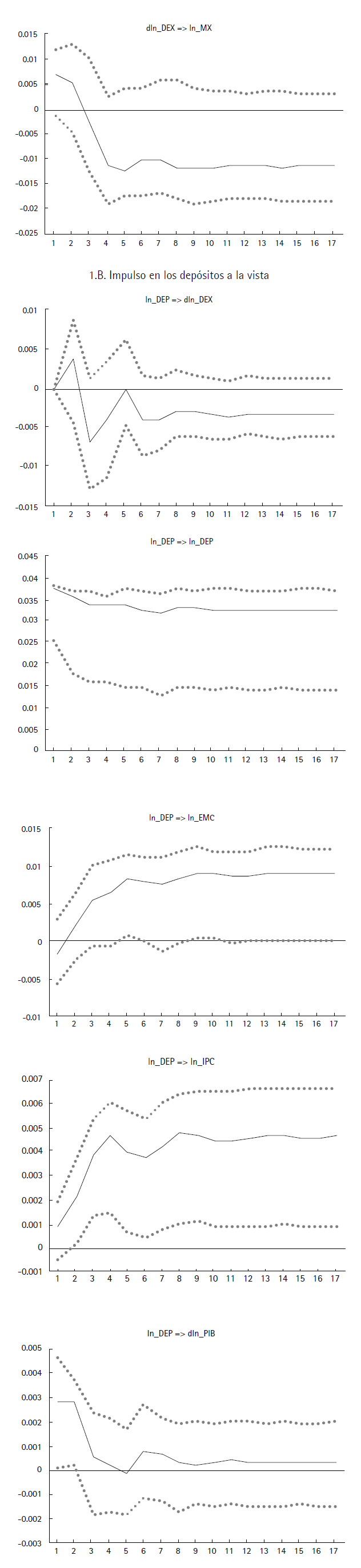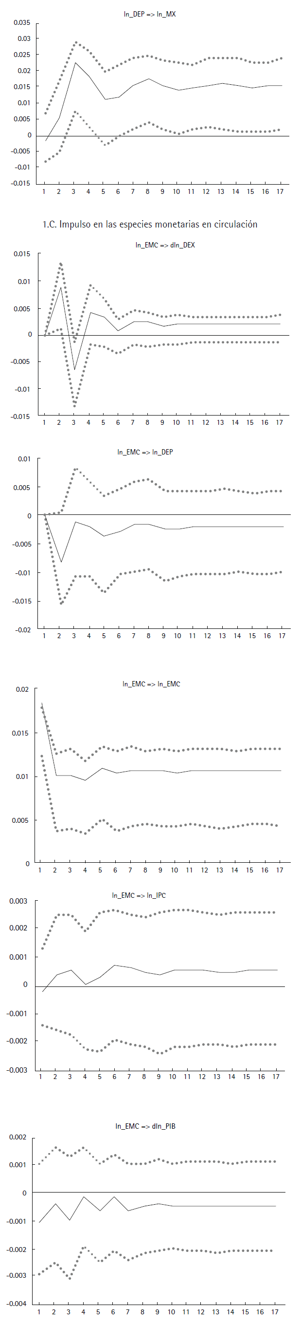 Entre los efectos de un shock en la moneda circulante (InEMCt) (figura 1, bloque C) destaca la ausencia de cambios significativos en la producción (InEMCt ⇒ ΔInPIBt), pese a que el shock genera un aumento permanente y significativo en el propio circulante (InEMCt ⇒ ΔInEMCt); tal resultado evidencia una neutralidad monetaria del circulante tanto a corto como a largo plazo. Asimismo, no se identifican efectos significativos en precios (InEMCt ⇒ ΔInIPCt), indicando la posibilidad de que la inflación no responde al circulante. A su vez, el shock en las especies monetarias tiende a aumentar la deuda externa (InEMCt ⇒ ΔInDEXt) y a reducir los depósitos (InEMCt ⇒ InDEPt) de forma significativa a corto plazo; ambos efectos refuerzan la tendencia a que un mayor circulante presiona al endeudamiento externo y a reducir los depósitos a corto plazo. También hay una contracción significativa y permanente en la ratio importaciones/exportaciones (InEMCt ⇒ InMXt), pudiendo asumirse que un mayor circulante parece enfocarse más en transacciones locales (o posiblemente en atesoramiento) que en importaciones.