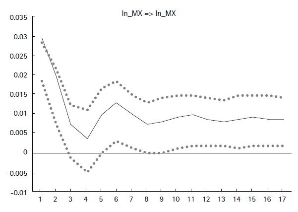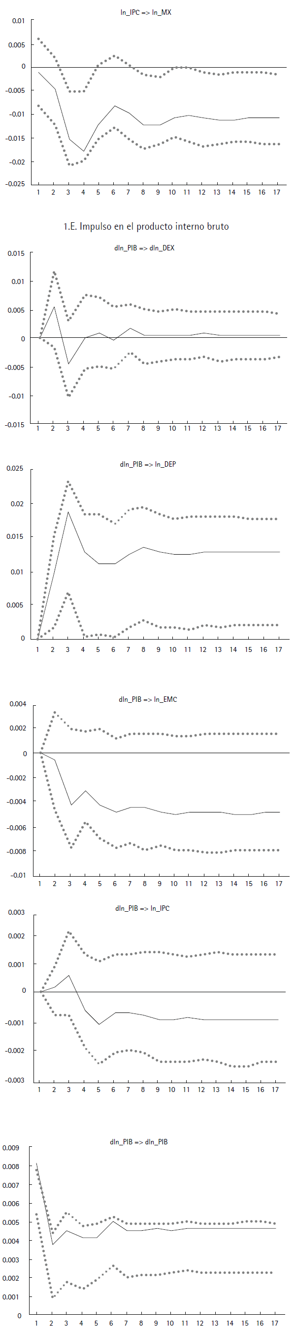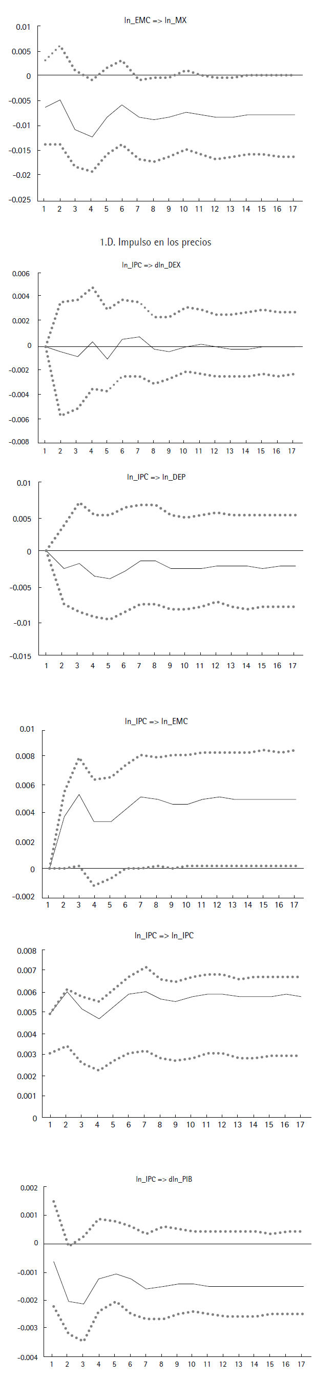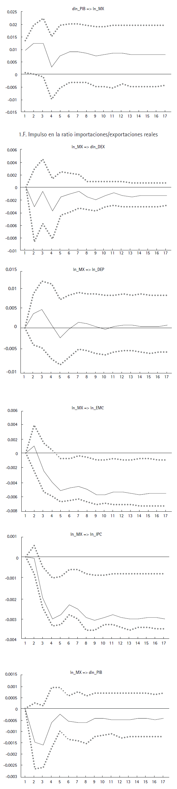 Con respecto a los efectos de un shock en la ratio importaciones/exportaciones reales (InMXt) (figura 1, bloque F) destaca la tendencia de la propia ratio a sostener un nivel significativamente mayor luego del shock (InMXt ⇒ InMXt). A la par, el shock en la ratio importaciones/exportaciones reduce la moneda circulante (InMXt ⇒ InEMCt) en el largo plazo y de forma significativa, sugiriendo una tendencia a la expulsión de circulante por saldos reales desfavorables en el balance comercial. Dicha contracción de las especies monetarias posiblemente ayuda a comprender la tendencia a la contracción de forma persistente y significativa de los precios ante el incremento de las importaciones relativas (InMXt ⇒ InIPCt), en tanto que un menor circulante interno puede derivar en una tendencia deflacionaria, pues una mayor parte de la demanda se terminaría cubriendo con productos importados antes que con producción local30.