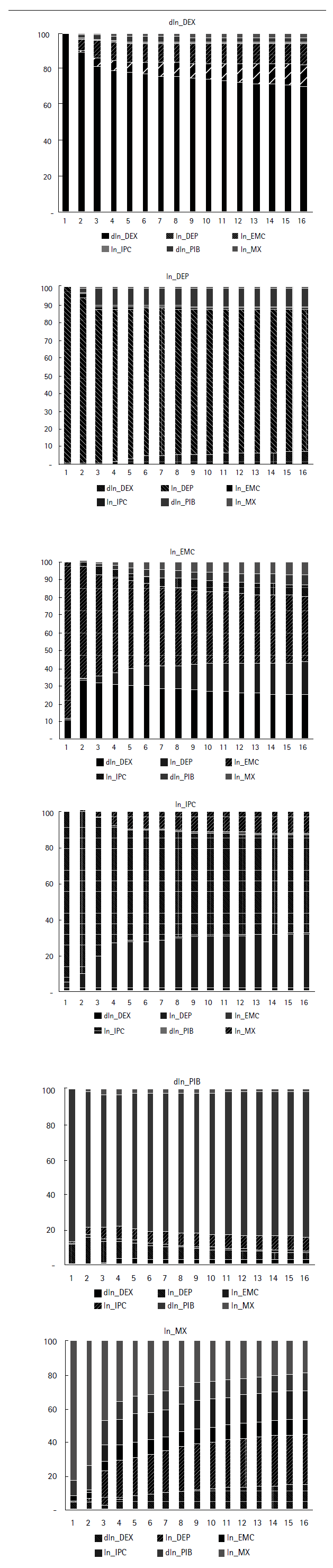 Fuente: elaboración propia.Pasando a la estimación de la FDVE para un horizonte de 16 trimestres, se encuentran varios patrones llamativos (figura 2). Por ejemplo, casi 24 % de la volatilidad de los flujos de deuda externa (ΔInDEXt) se debe a los depósitos (12.4 puntos porcentuales [pp.]) y a las EMC (11.3 pp.) como reflejo de que, al pasar el tiempo, una fracción relevante de la deuda es empujada por la dinámica monetaria del Ecuador dolarizado. En los depósitos (InDEPt) se refuerza la tendencia a la endogeneidad monetaria, pues 11.2 % de su volatilidad se asocia a la producción, mientras que 6.7 % se vincula a la deuda externa.