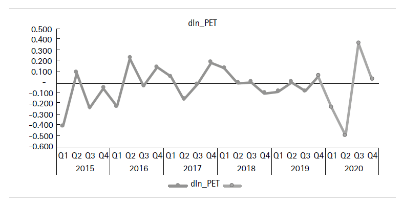 Por último, es posible simular el comportamiento de las variables endógenas del modelo VEC usando información de las fluctuaciones del precio del petróleo (ΔInPETt) disponible para los cuatro trimestres del año 2020 (figura 3). Cabe aclarar que dicha simulación no tiene fines predictivos (pues en el 2020 la crisis del coronavirus afectó a muchas variables y factores que no se consideran en este trabajo), sino que ilustra cualitativamente el comportamiento del modelo ante shocks en una de las variables exógenas más influyentes en la vida económica del Ecuador contemporáneo.