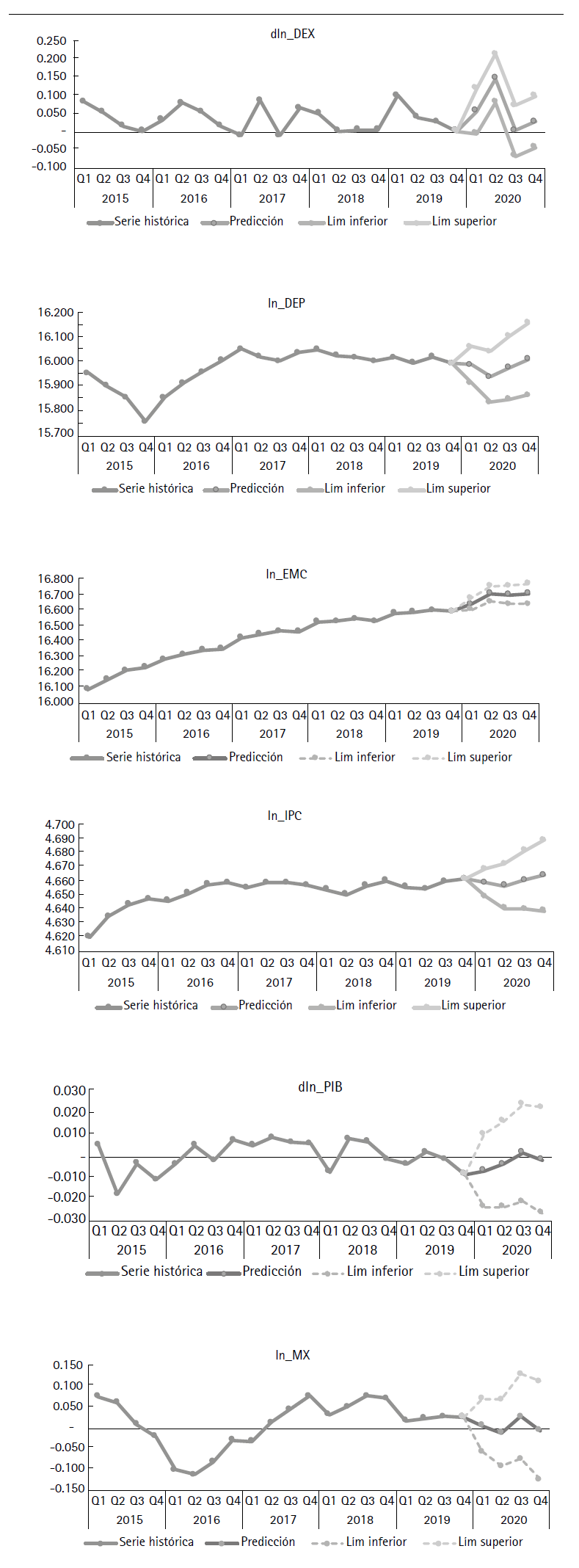 Después, usando (2) pueden estimarse funciones impulso-respuesta ortogonales (Firo) que describen los efectos de un shock en una variable sobre las demás variables endógenas, y funciones de descomposición de la varianza del error de predicción (FDVE) para describir cuánto de la volatilidad de una variable se “explica” por las demás variables endógenas. Estos resultados se sustentan en la descomposición de Cholesky de la matriz de varianza-covarianza de εt , la cual asume que las variables se ordenan de la “menos endógena” a la “más endógena” (aquí pueden efectuarse pruebas de robustez con diferentes ordenamientos de variables) (Kilian y Lütkepohl, 2017; Tsay, 2005).