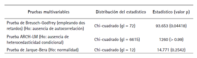 Por su parte, cuando se evidencia que Xt∽ l (1) usando por ejemplo la prueba Dickey-Fuller ampliada (ADF, por su sigla en inglés) sobre sus elementos, puede realizarse una prueba de la traza (y del valor propio máximo) para identificar el número de vectores de cointegración. Luego se puede estimar el modelo VEC empleando el método de máxima verosimilitud de Johansen (1988, 1991, 1995) y Johansen y Juselius (1990)11, lo que requiere probar que los residuos son estacionarios y normales; tal validación puede hacerse con las pruebas multivariables de autocorrelación de Breusch-Godfrey, de ausencia de efectos de heterocedasticidad condicional autorregresiva (ARCH-LM) y de normalidad de Jarque-Bera.