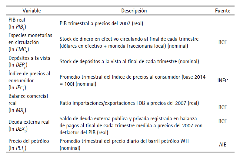 La base de datos utilizada cubre un período desde el primer trimestre del año 2000 hasta el cuarto trimestre del 2019 (ochenta observaciones trimestrales) e incluye como representante de la producción yt al PIB real, como representantes de las variables monetarias mt a las especies monetarias en circulación (EMC), los depósitos a la vista (DEP) y el índice de precios al consumidor (todas nominales13), y como variables reales vt con posible incidencia en el vínculo producción-dinero, dada la condición dolarizada y abierta de la economía ecuatoriana, se incluye a una proxy del balance comercial real (importaciones reales/exportaciones reales, representando a la tendencia de salida de flujos de dólares del Ecuador con el resto del mundo por transacciones comerciales)14 y al saldo de deuda externa real15. Se agrega como variable exógena al precio del petróleo nominal para identificar sus potenciales efectos reales y monetarios; dicha exogeneidad se justifica considerando que Ecuador actúa como precio-aceptante en el mercado petrolero mundial (García-Albán et al., 2020). Los detalles de las variables se presentan en el cuadro 1. En todos los casos se toman datos en logaritmos y desestacionalizados16.