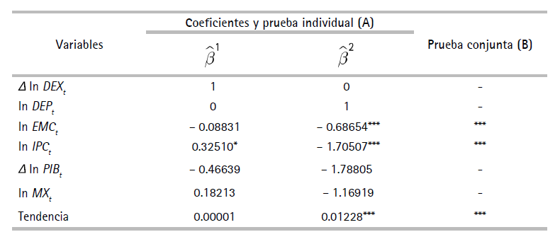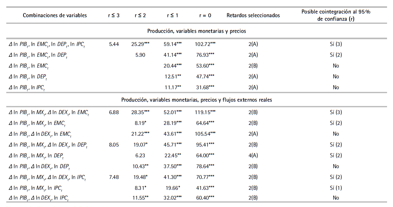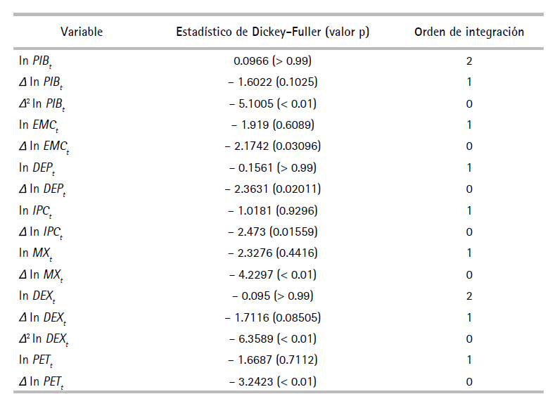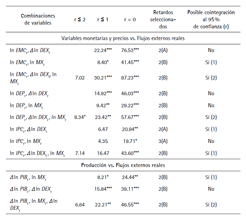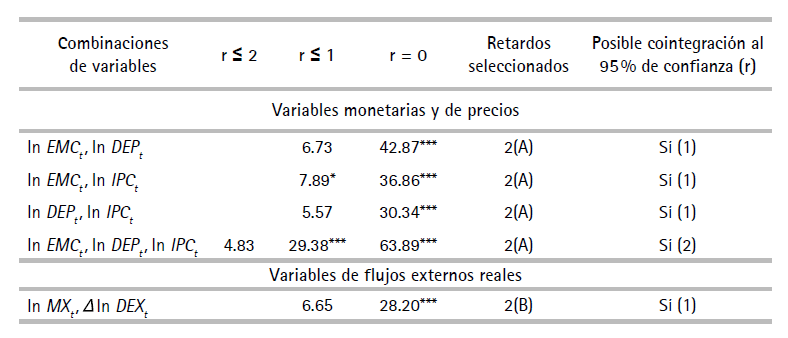 En el cuadro 2 se estudia el orden de integración de las variables seleccionadas con la prueba ADF, cuyos resultados sugieren que todas las variables monetarias y de precios son integradas de orden 1, por lo que las pruebas de cointegración que se presentan más adelante emplean estas variables en nivel; igual resultado se obtiene para el balance comercial real. En cambio, el PIB y la deuda externa reales se muestran como integradas de orden 2, de modo que las pruebas de cointegración utilizan las primeras diferencias de estas variables.