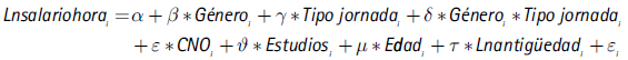 Con e Ji independientes e idénticamente distribuidas y E (e Ji /X Ji) = 0, donde X Ji es el vector que contiene las características individuales, el subíndice J denota si consideramos la población a tiempo completo o a tiempo parcial, y el subíndice i denota toda la población, masculina y femenina. En total se estiman seis ecuaciones por MCO.