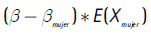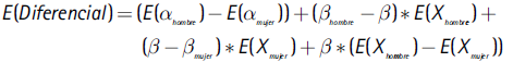 La parte no explicada del diferencial y su descomposición en discriminación a favor del hombre y en contra de la mujer, pueden reescribirse en función de los factores empleados en las regresiones, para ello se desglosan los valores medios de las características (11),