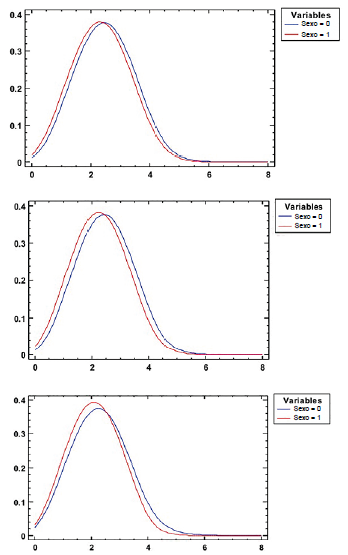 Las curvas de la figura 1 son histogramas suavizados que revelan la forma de cada distribución para las muestras de datos. Se advierte cómo las curvas se separan más para los trabajadores a tiempo parcial, confirmando así que hay mayores diferencias salariales entre hombres y mujeres en este tipo de jornada; estando, además, más escoradas hacia salarios más bajos, ratificando así que los salarios son menores en las jornadas a tiempo parcial que a tiempo completo. Testamos la significación de esta diferencia con la estimación de la ecuación (12).