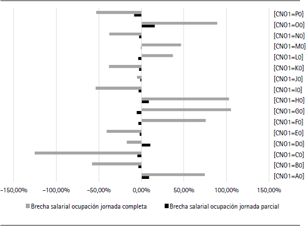 En términos generales, la ocupación que desempeñan los individuos afecta más a la brecha salarial de los trabajadores a tiempo completo (5.90 %) que a la de los trabajadores a tiempo parcial (1.3 %). En cuanto al sentido, como se observa en la figura 2 en la que las barras correspondientes son positivas, la ocupación que se corresponde con los salarios más altos, A 0, y la que se corresponde con los salarios más bajos, O 010, tanto para los trabajadores a tiempo completo como para los trabajadores a tiempo parcial, aumentan la distancia entre los salarios masculinos y femeninos, contribuyendo más a esta diferencia en favor del hombre la ocupación correspondiente a los salarios más altos en los trabajadores a tiempo completo y la correspondiente a los salarios más bajos en los trabajadores a tiempo parcial.