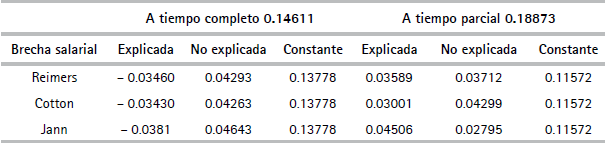 Junto a ello, cuando se descompone la discriminación en sus dos formas, los resultados difieren. En los tres métodos predomina la discriminación en contra de la mujer para los trabajadores a tiempo completo y a favor del hombre para los trabajadores a tiempo parcial.