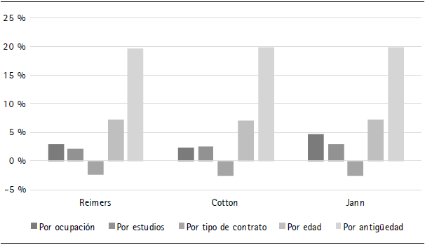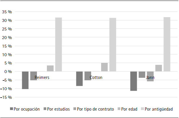 En su descomposición en las dos formas de discriminación, los métodos basados en Reimers (1983) y Cotton (1988) proporcionan prácticamente los mismos resultados. Para ellos, solo con respecto a la edad la discriminación a favor del hombre domina a la discriminación en contra de la mujer. Para el resto de las variables introducidas ocurre lo contrario. Así, la discriminación por niveles de estudio se inclina más a favor del hombre –esto dado su signo negativo–, lo que significa que menores niveles de estudio perjudican más a los hombres que lo que beneficia a las mujeres.