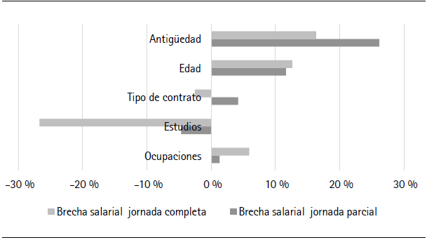 En los trabajadores a tiempo completo las diferencias en las características poblacionales de hombres y mujeres tienen prácticamente en la brecha salarial el mismo peso que la discriminación, que se mueve en torno al 30 %, predominando la discriminación negativa hacia la mujer por encima de la positiva a favor del hombre.