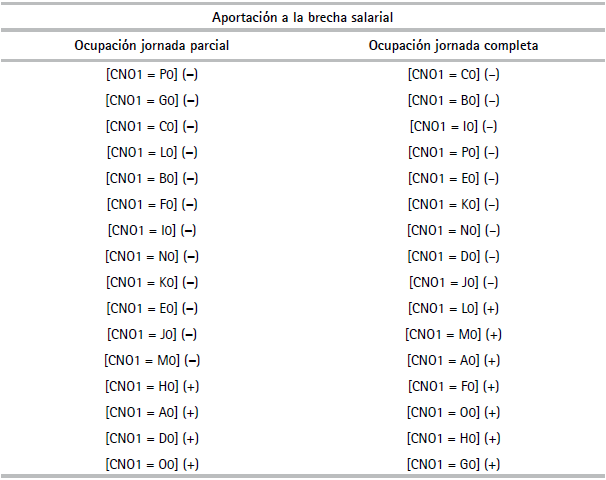 Y, como se ha puesto de manifiesto en la figura 2, las ocupaciones que más contribuyen son la de “Trabajadores no cualificados en servicios [O 0]” para los trabajadores a tiempo parcial, que lo hace en sentido positivo a la brecha, es decir, perjudicando al salario femenino; y para los trabajadores a tiempo completo la de “Otros técnicos y profesionales científicos e intelectuales [C 0]”, que lo hace en sentido negativo, esto es, favoreciendo al salario femenino, y “Trabajadores de los servicios de restauración y comercio [G 0]” que lo hace en sentido positivo, es decir, perjudicando al salario femenino.