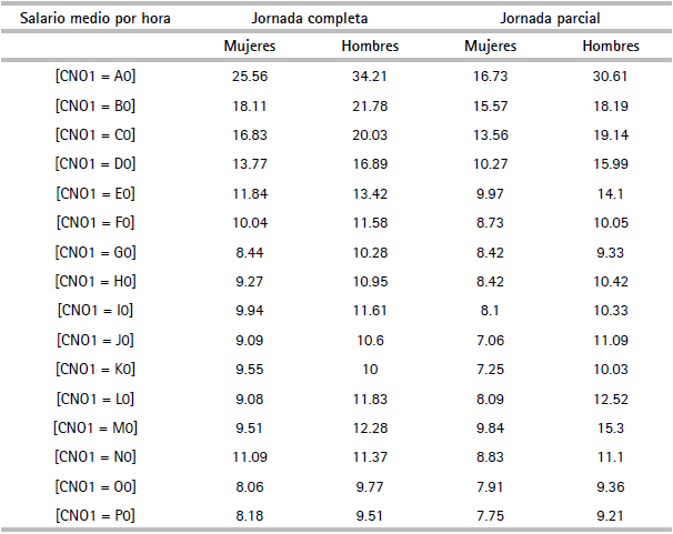 Si estos datos se combinan con la segregación ocupacional que se produce en ambos tipos de jornadas, al haber un porcentaje alto de mujeres contratadas a tiempo parcial en estas ocupaciones discriminatorias (10.9 % y 16.2 % respectivamente), el resultado total es beneficioso para la mujer. Mientras que las trabajadoras a tiempo completo con ocupación en [O 0] son relativamente pocas (5.6 %), por lo que no resultan especialmente perjudicadas.