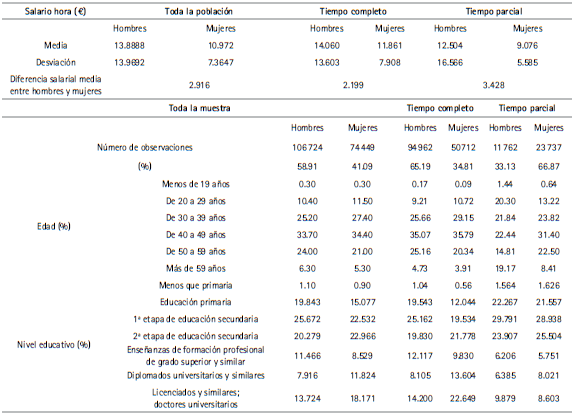 Para realizar este estudio se tomaron los datos de la EES-2018, últimos publicados por el INE de la serie cuatrienal de esta operación estadística –datos que, según nuestro conocimiento, aún no shan aprovechado para estos análisis–, así, el último trabajo que hemos encontrado usando la base de datos de la citada encuesta ha sido el de Anghel et al. (2019), que emplean la anterior encuesta de 2014, destacando también lo hecho por Murillo et al. (2016), que usan las olas de 2002, 2006 y 2010 de la EES. Nos hemos restringido a los trabajadores del sector privado, ya que el comportamiento de la brecha salarial en ellos es significativamente diferente al de los trabajadores del sector público, como está bien establecido en la literatura desde los primeros estudios de los años setenta del siglo pasado (véase Sławin´ska, 2021). En primer lugar, obtenemos la variable salario/hora mensual siguiendo las notas metodológicas del INE, puesto que será el logaritmo neperiano de este el que se tomará como variable dependiente en el resto del estudio. Como factores explicativos tomamos aquellas variables que, según la literatura, pueden afectar a los niveles salariales: edad, nivel educativo, tipo de contrato, ocupación y antigüedad en meses. El cuadro 1 presenta los estadísticos por género de estas variables para los tres grupos poblacionales considerados. Los hechos más relevantes para el estudio observados en este cuadro serán sometidos a contrastes paramétricos para analizar su significatividad en la población.