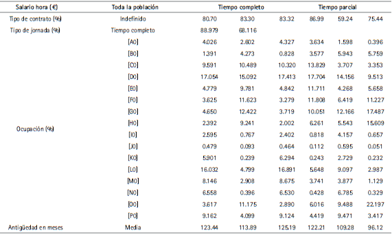 Con Ԑ (E)=0 , que estimamos por mínimos cuadrados ordinarios (MCO) para toda la población y separadamente para los trabajadores contratados a tiempo completo y los contratados a tiempo parcial. El tratamiento simultáneo e independiente de estos colectivos es una de las contribuciones del trabajo.